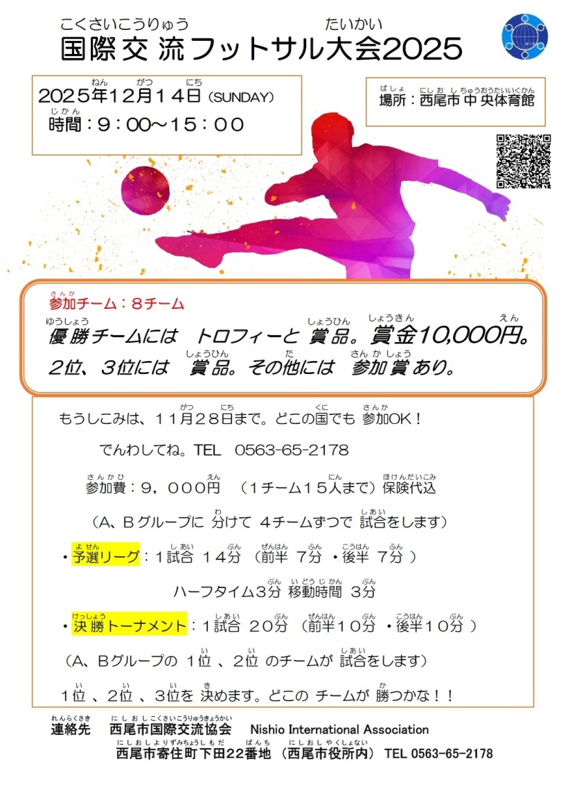 2025年10月21日(火) 国際交流フットサル大会2025を します! みんなで フットサルを しましょう! どこの 国(くに)の 人(ひと)でも 参加(さんか)できます。 【いつ】2025年12月14日(日) 9時から15時まで 【どこ】西尾市中央体育館(にしおしちゅうおうたいいくかん) 【おかね】9,000円(参加費と保険) 【チーム】8チーム 申し込みは11月28日(金)まで。 電話してください。(0563-65-2178)