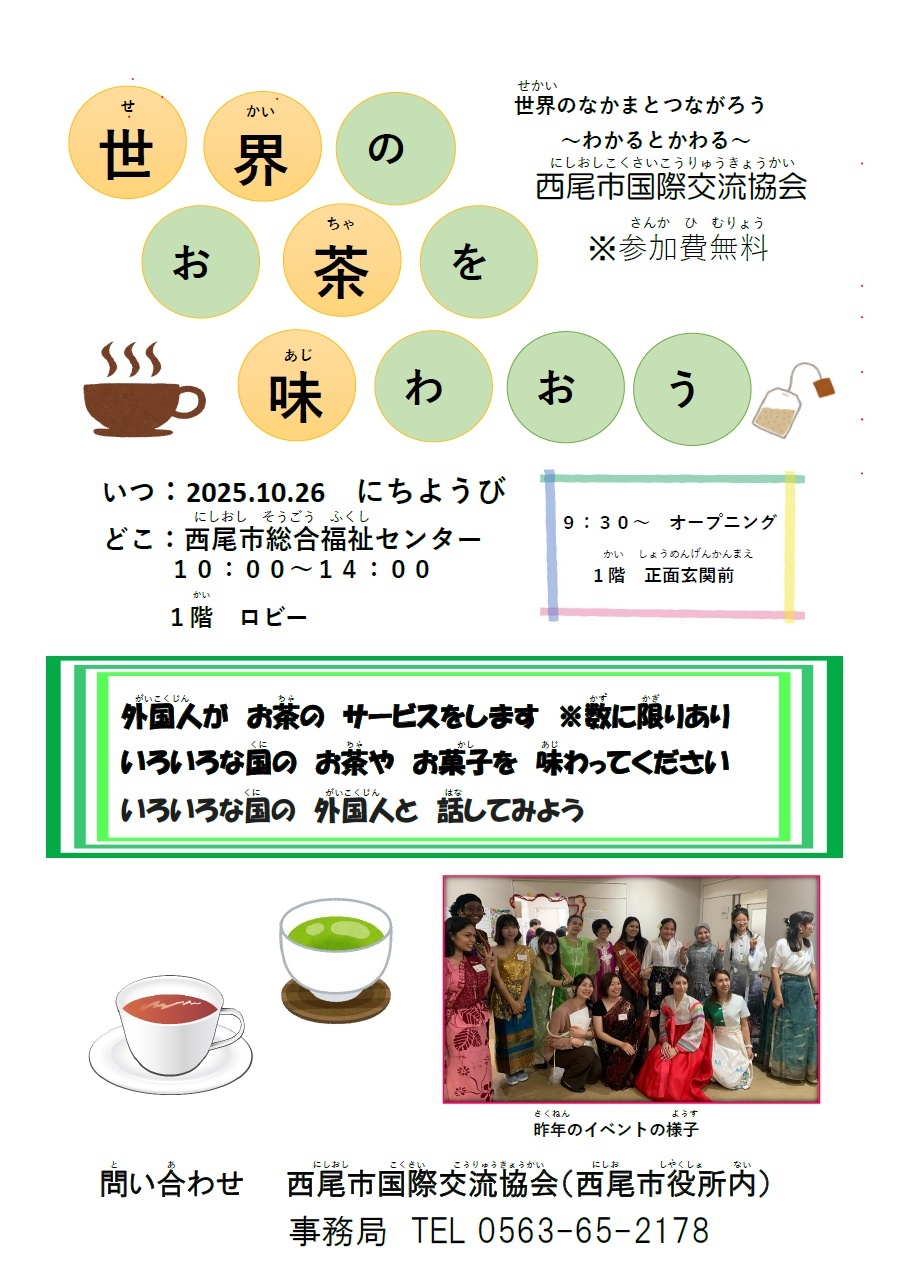 2025年10月24日(金) にしお福祉まつりに出展します♪ チラシ「世界のお茶を味わおう」 皆さんは、お茶が好きですか? 日本では様々な種類のお茶が飲まれています。 特に西尾市では「西尾の抹茶」が親しまれていますよね。 では、世界ではどのようなお茶が飲まれているのでしょうか。 西尾市国際交流協会では、ブースタイトル「世界のお茶を味わおう」として、にしお福祉まつりに出展します。 いろいろな国のお茶を飲み比べて、味や香りを楽しんでみてください。 お菓子も準備して、お待ちしています。 ぜひ、足を運んでください!