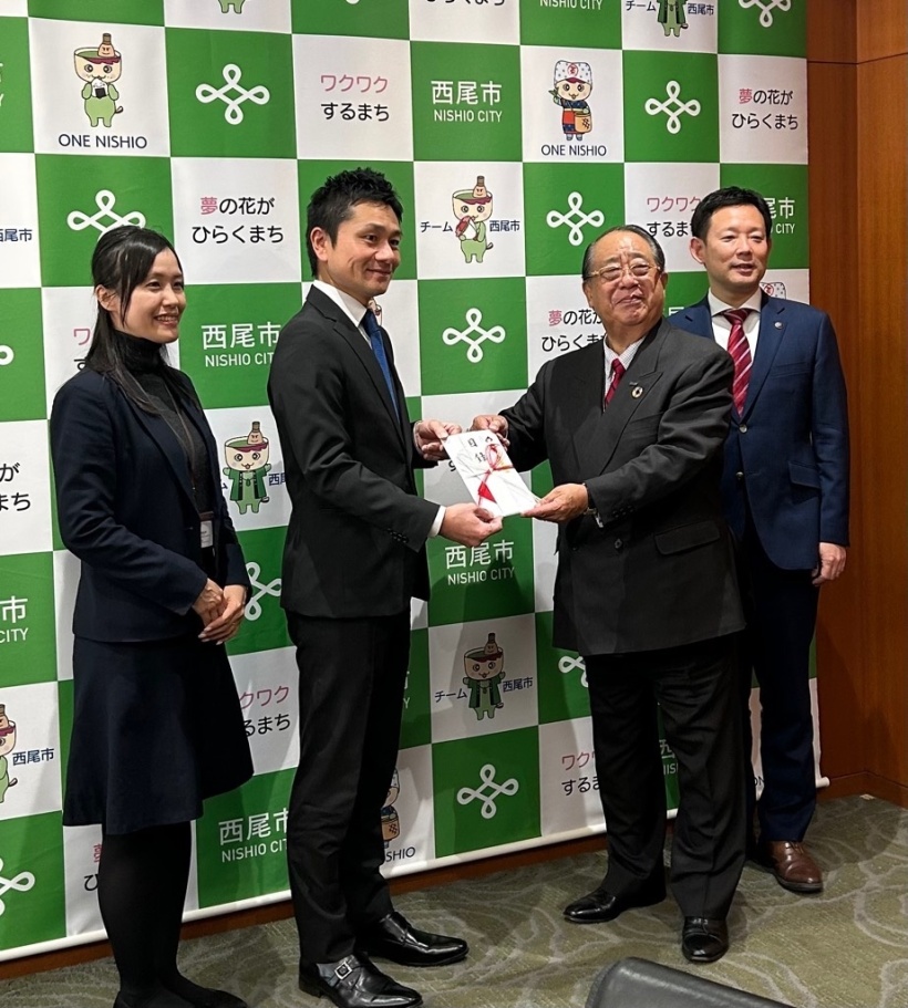 当協会の顧問であります中村市長同席のもと、三菱UFJ銀行西尾支店岡田支店長様から杉浦会長へ寄付金を贈呈いただきました。