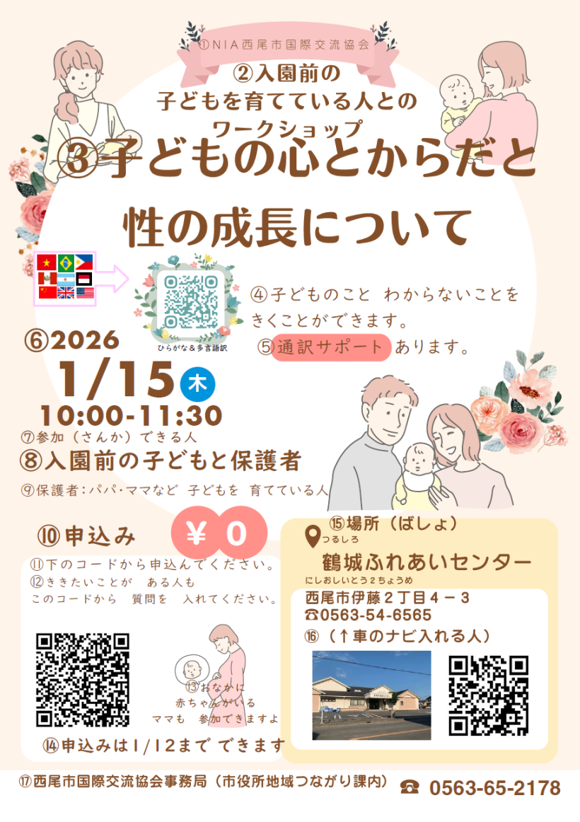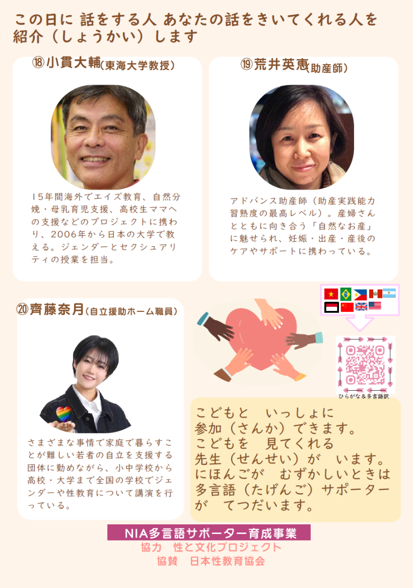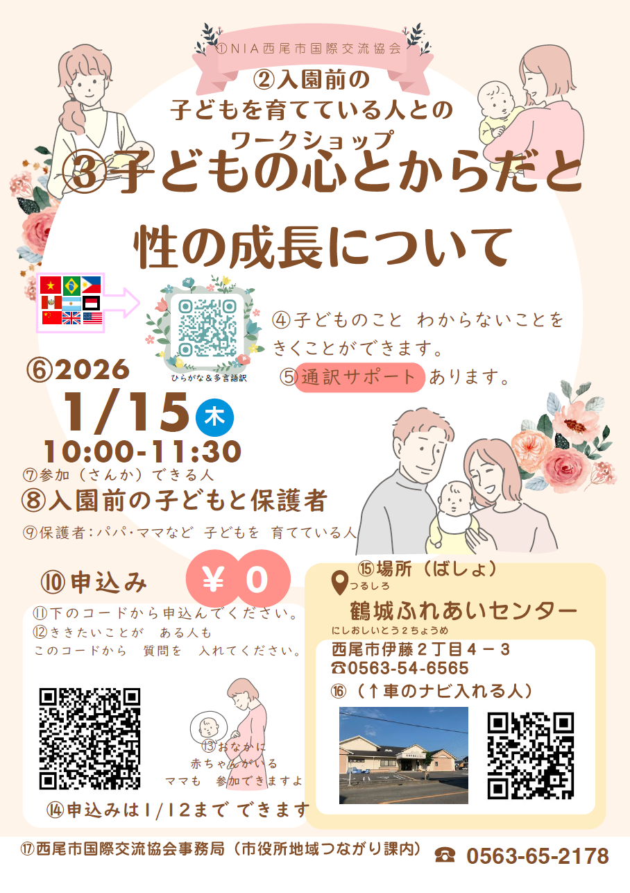 【内容】子どもが、性への誤解や偏見なく健康に育つために、保護者が知っておきべきことや子どもへの伝え方などを、ワークショップ形式で学びます。