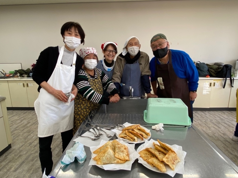 アルゼンチン出身のマリアさんがみなさんのために、わかりやすいレシピとアルゼンチン文化の説明も含めた資料をていねいに作ってきてくださっていました。それではじめに説明し、それぞれのグループで担当料理を作っていきました。みなさん、手際が良く、予定より早く食べることができました。参加された方々も、初対面同士でも楽しくおしゃべりしながら、協力して料理づくりをされていました。マリアさんがサンタクロースやトナカイの帽子を持ってきてくださっていたので、みんなでクリスマス気分でウキウキ、ワイワイ作業を進めることができました。フルーツサラダのカップに一つ一つ添えるための、手つくりサンタクロースまたはトナカイのピック、デザートのパネトーネ、お土産のクリスマスプレゼントに至るまで、マリアさんの愛に包まれて、みなさん幸せな気分で帰って行かれました。
