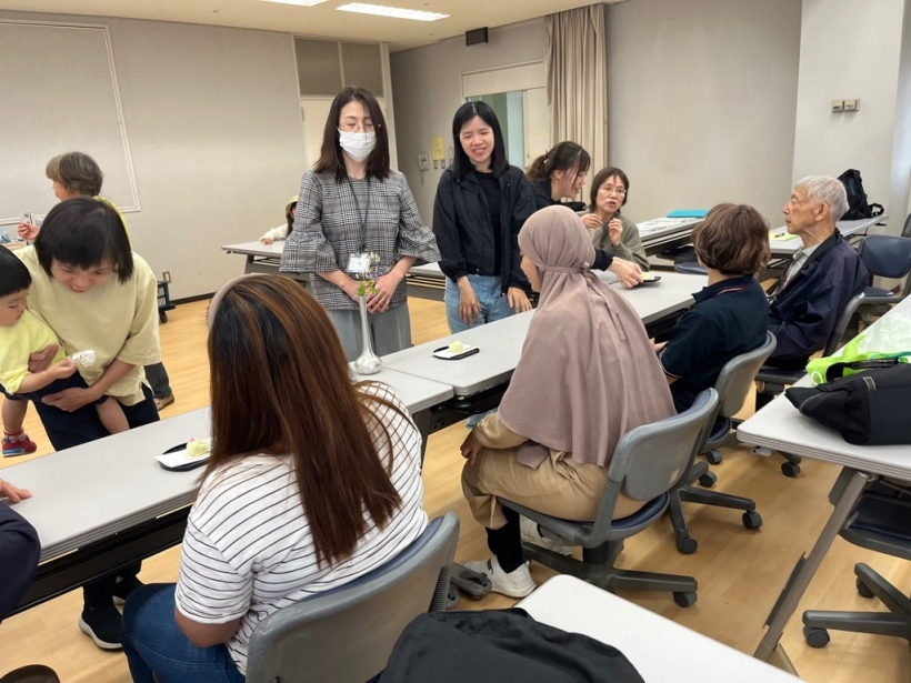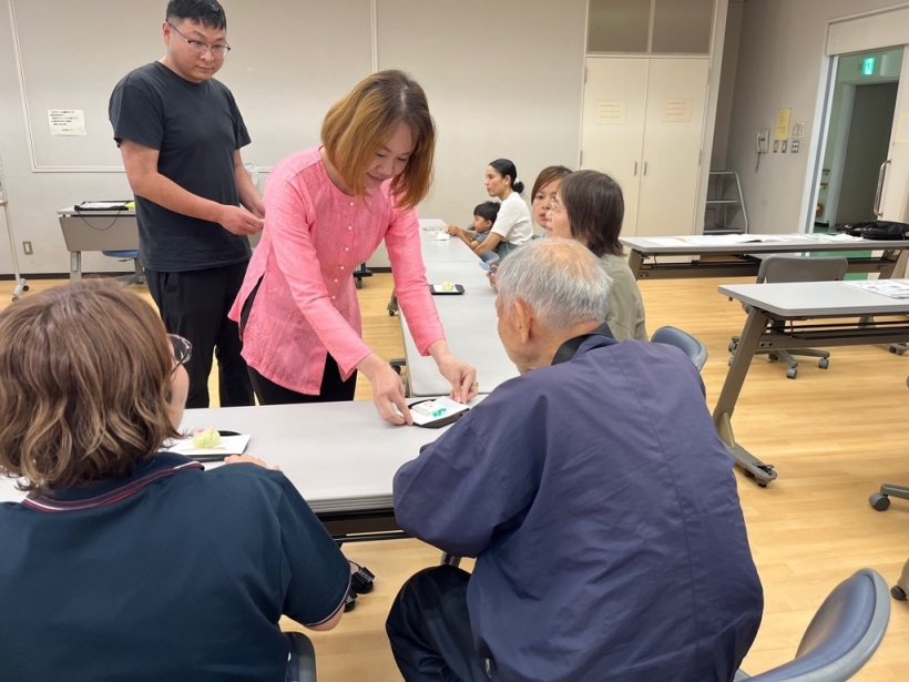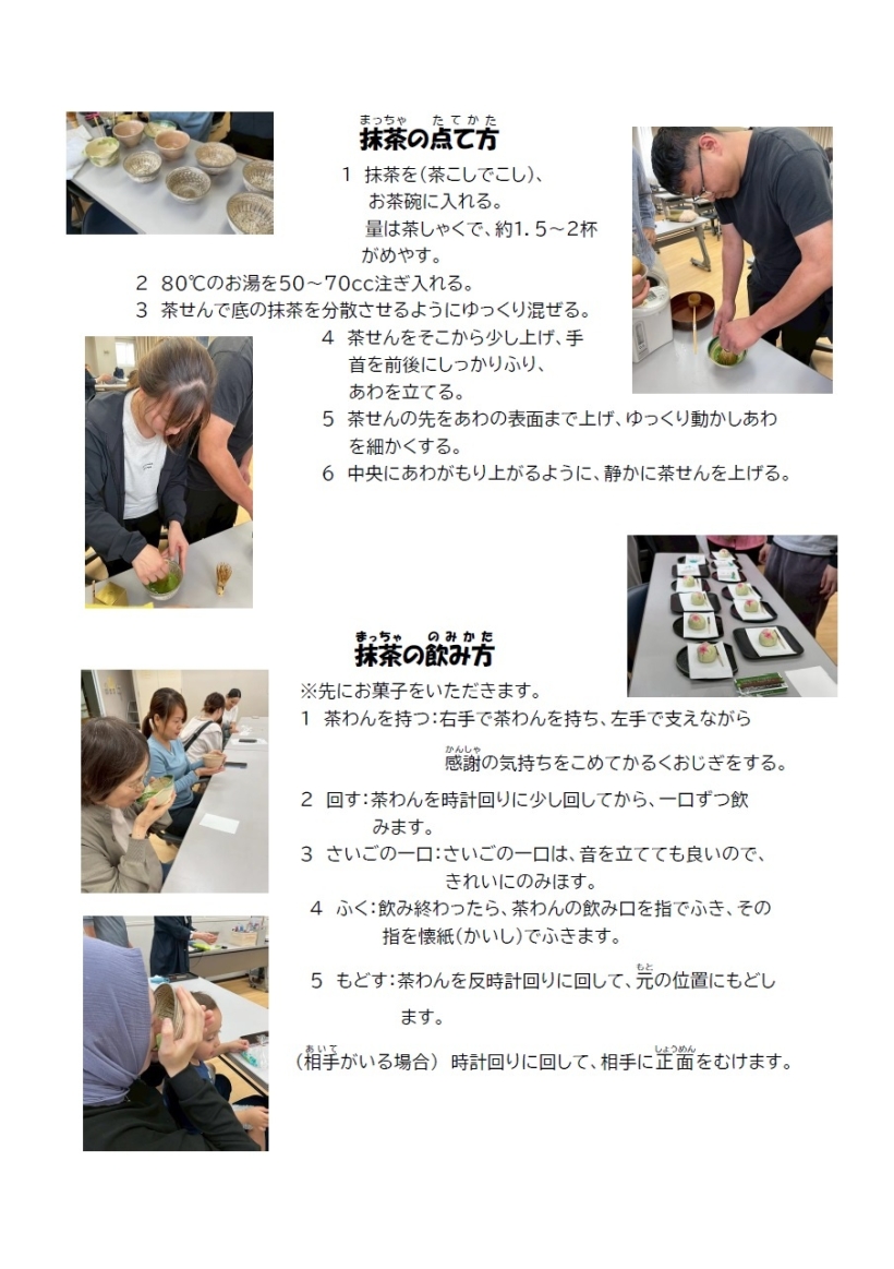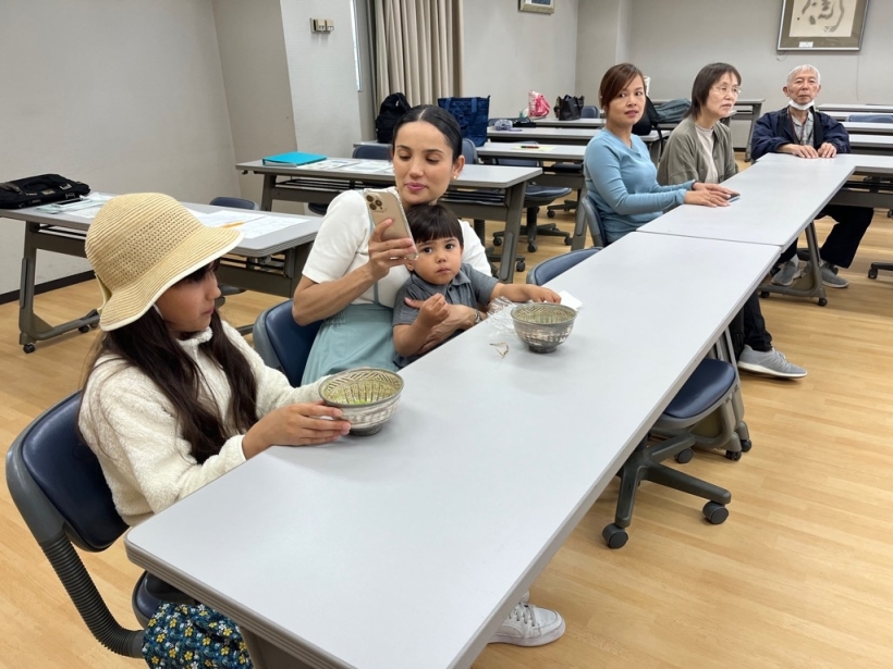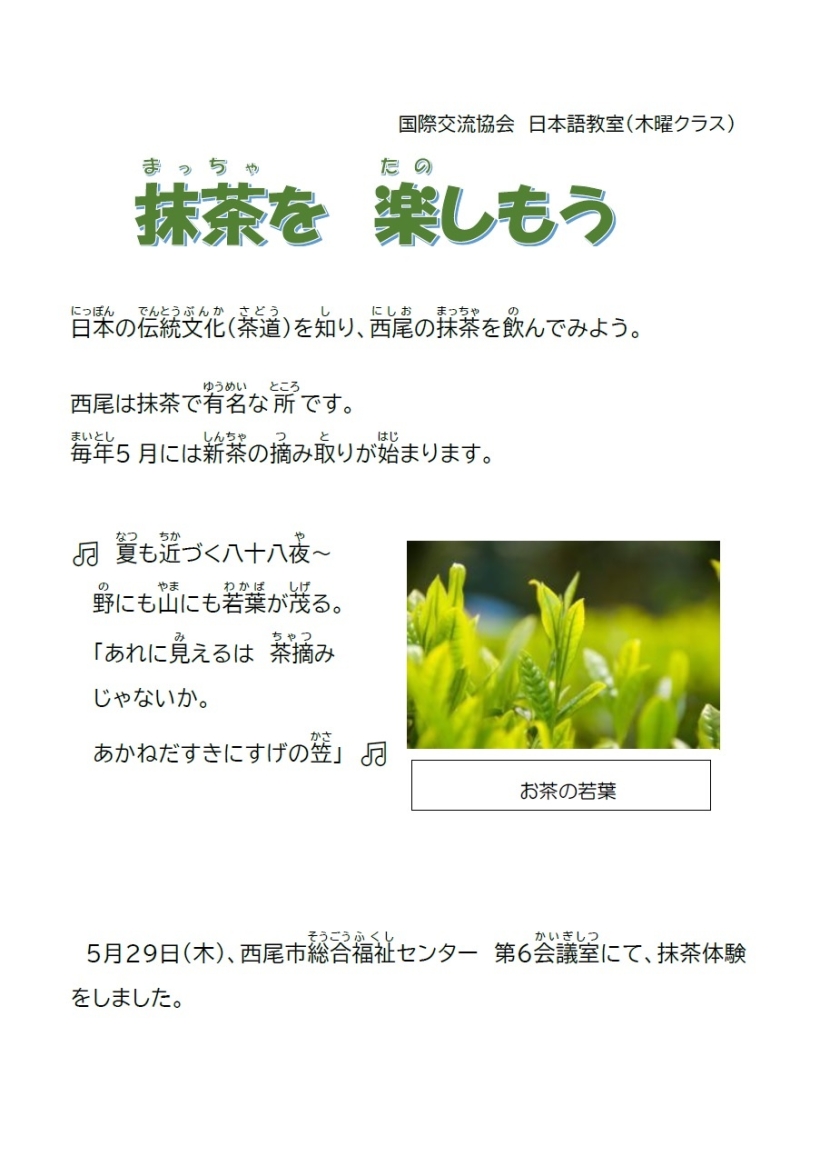日本語教室(木曜クラス) 2025年5月29日 【活動報告】西尾の抹茶を楽しもう 5月29日(木)、西尾市総合福祉センター第6会議室にて、抹茶体験をしました。 参加者は、日本の伝統文化である抹茶の作法などを学びました。また、おいしい抹茶やお干菓子を楽しみました。