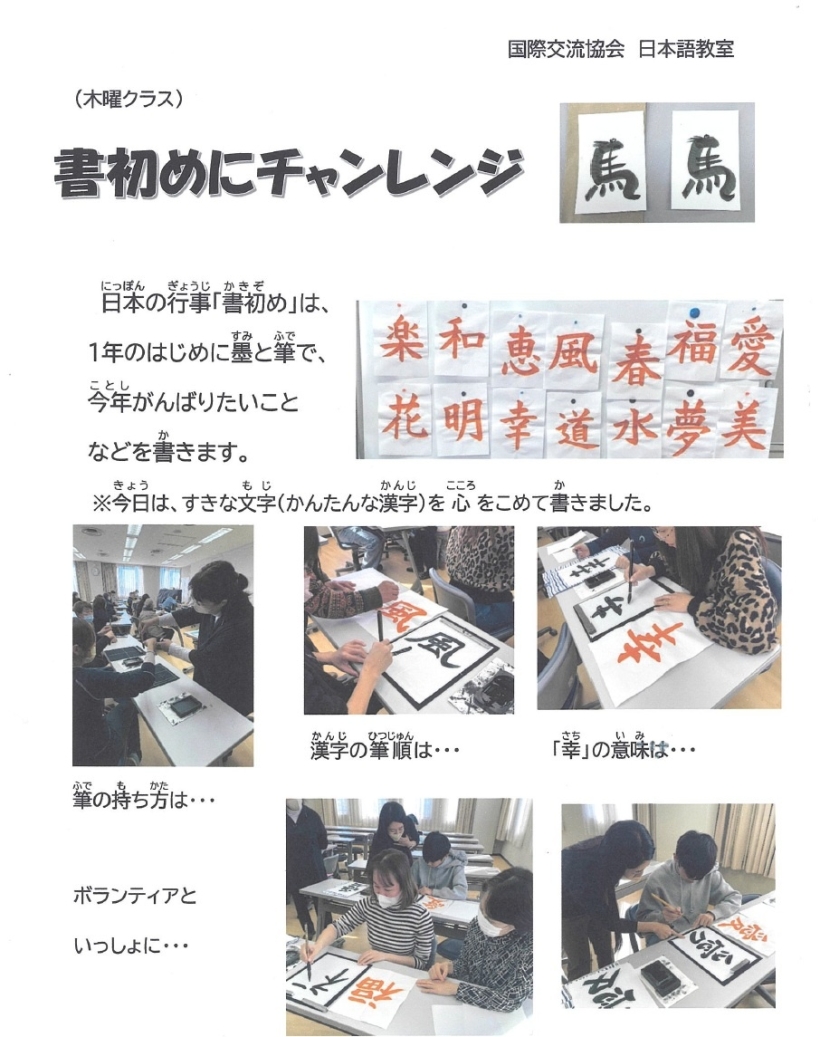 日本語教室(木曜クラス) 2026年1月15日 書初めにチャレンジ 木曜クラスでは、「書初め」にチャレンジしました。 書初めは、1年のはじめに墨と筆で今年頑張りたいことなどを書く日本の行事です。 今回は、すきな文字を、心をこめて書きました。