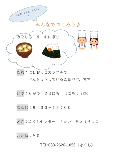 2024年06月23日(日) にしおっこカラフル(nishiokko-colorful) みそしるとおにぎり をつくろう 6月23日(にちようび)9:30- ふくしセンター 2かい ちょうりしつ みんなで みそしる と おにぎり をつくろう♪ べんきょうは なし ほんも よみません パパ、ママもきてね 対象:にしおっこカラフルのこたちとそのかぞく